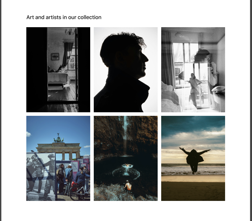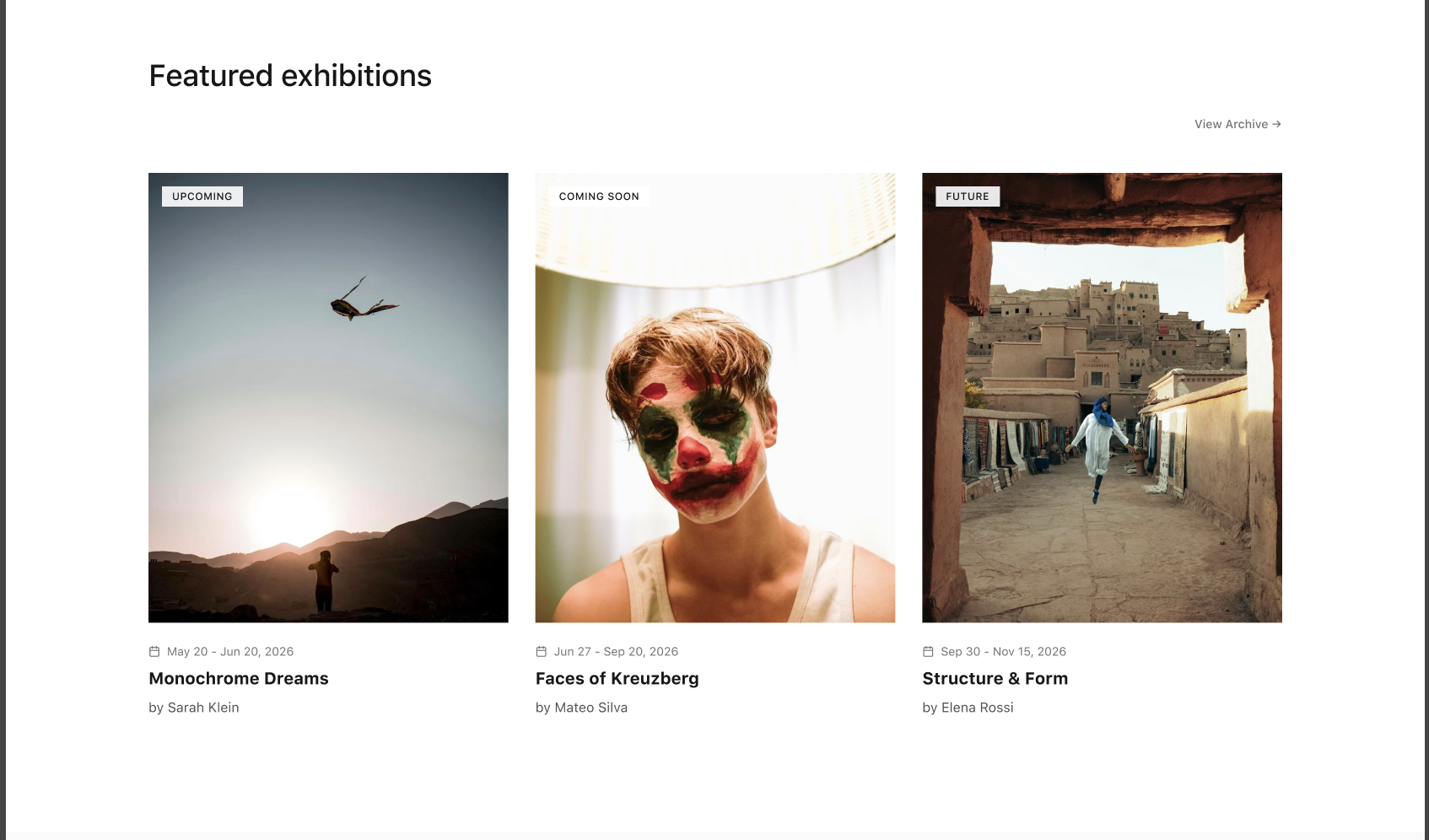 | Exhibition Listing | Text-heavy | Card-based grid, high-res images |